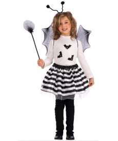 Un déguisement pratique et express qui comprend la jupe rayée noire et blanche avec tulle noir en dessous, les ailes, le serre tête ainsi que la baguette qui se termine par une inévitable chauve souris !