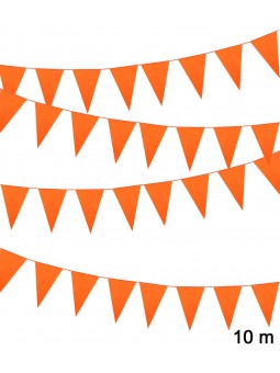 Guirlande de fanions orange mesurant environ 10 m de longueur. Elle est ornée de 20 fanions en plastique de 20 x 30 cm