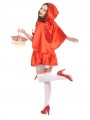 Nous vous proposons cette tenue du petit chaperon rouge qui ici comprend la robe façon bustier sur laquelle est fixée le tablier blanc et la cape courte rouge à capuche.