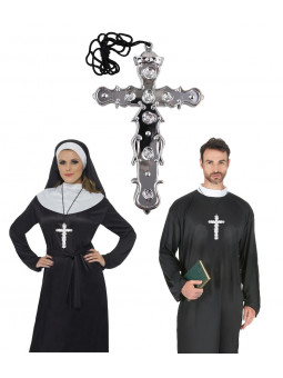 Pendentif croix en plastique argenté (16 x 11cm - épaisseur 1cm) sur un cordon noir ajustable.